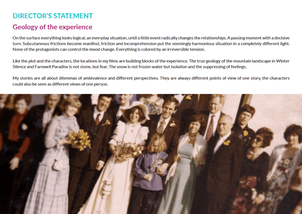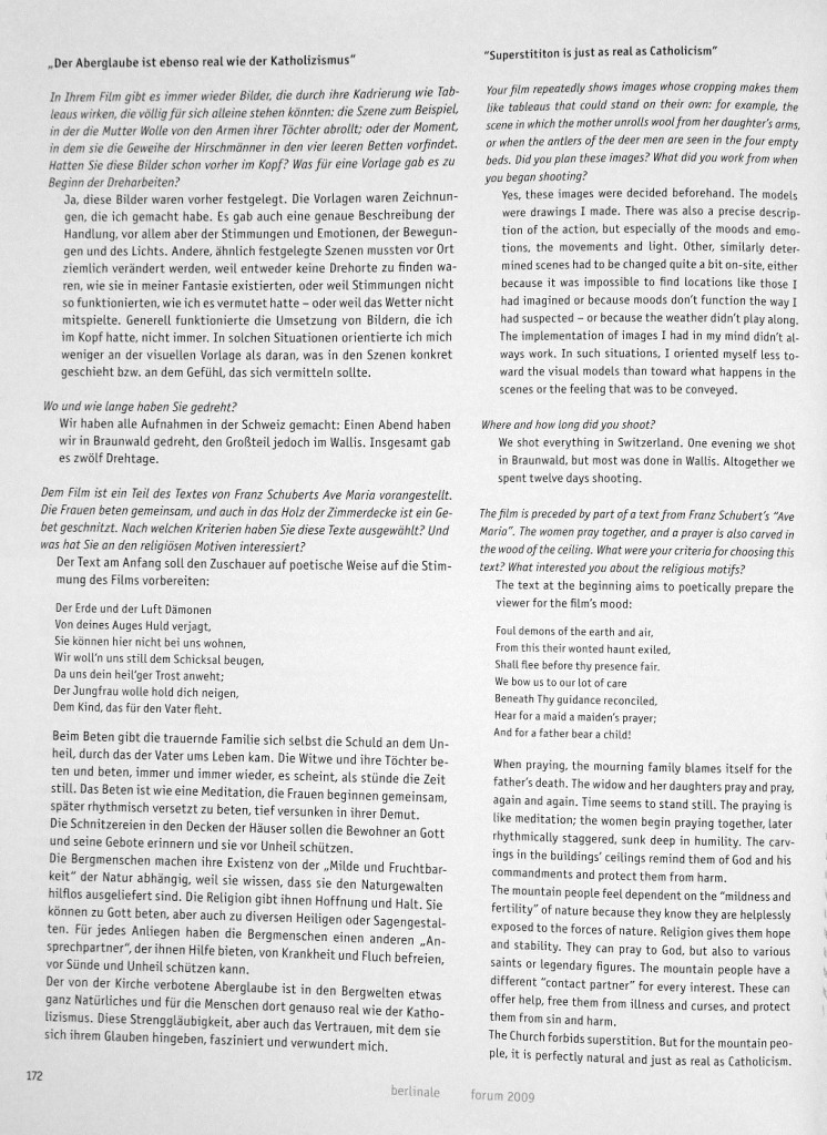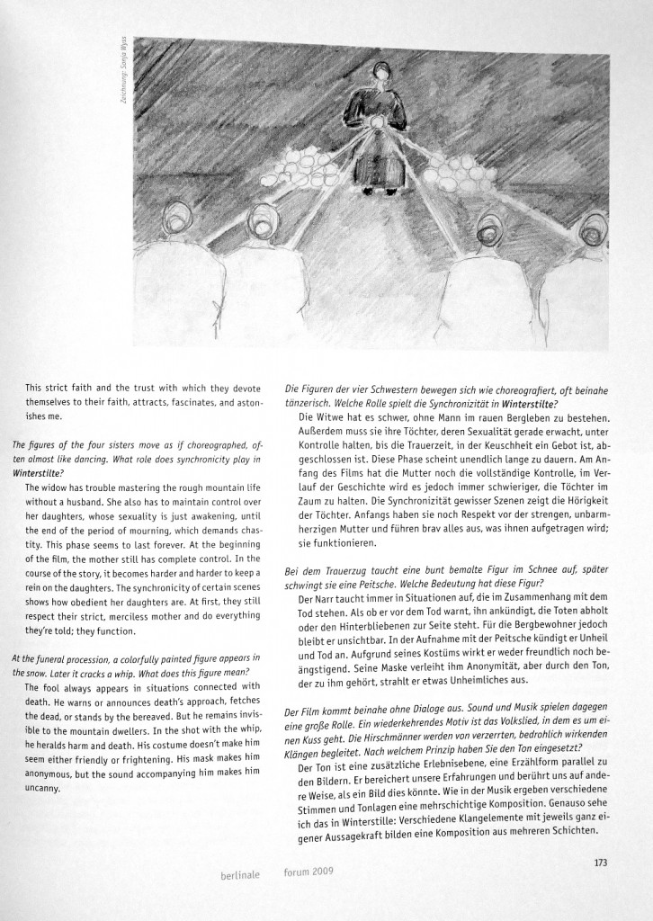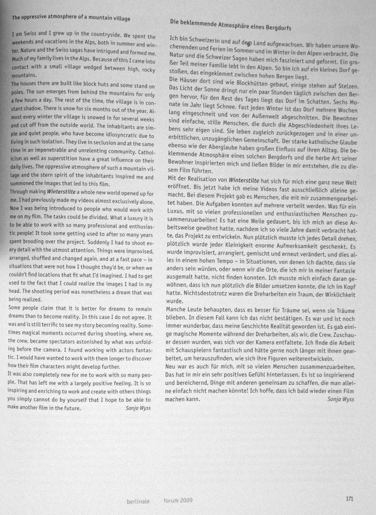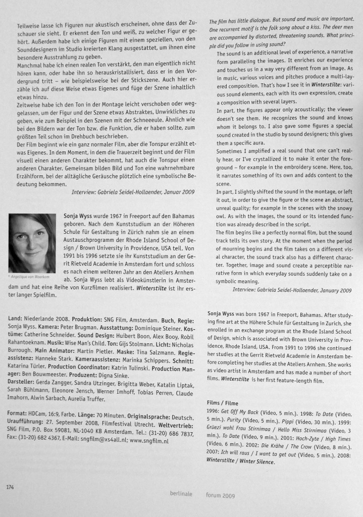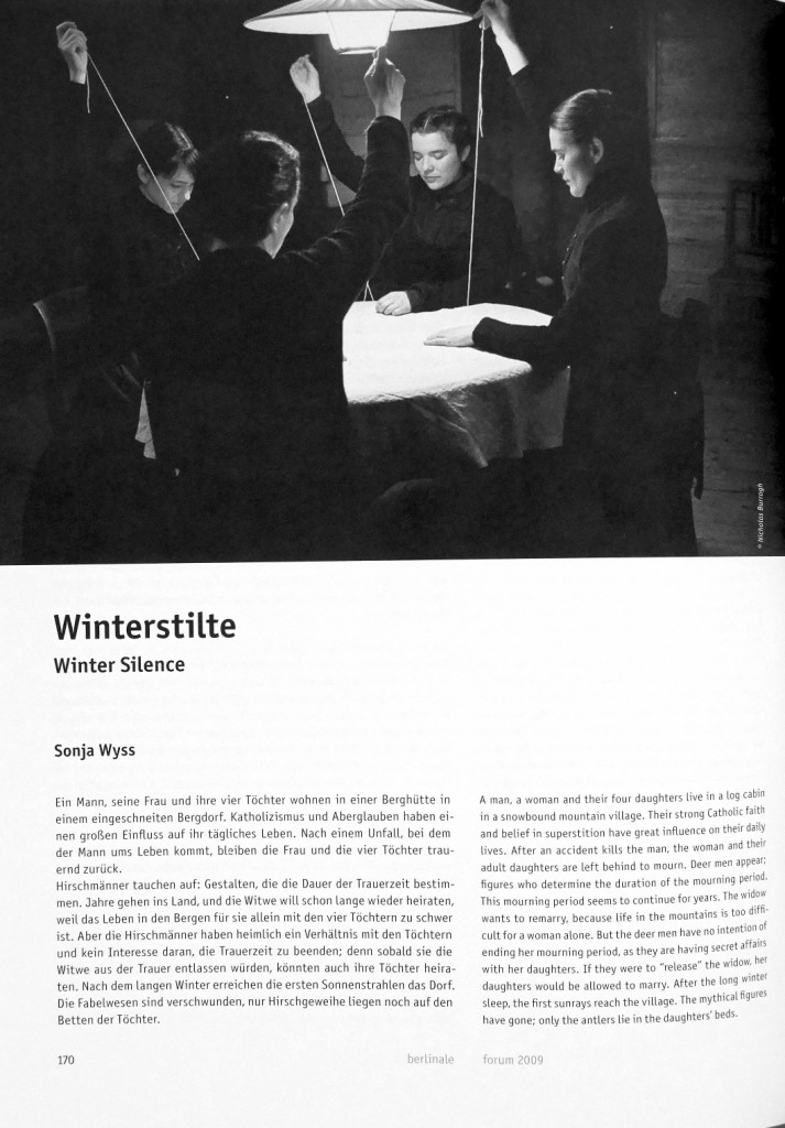 Variety – “Striking image of a hard-edged brilliance are reason to see “Winter Silence”, video artist Sonja Wyss’ feature debut, composed of often dazzling tableaux in an isolated Swiss village suspended in time.”