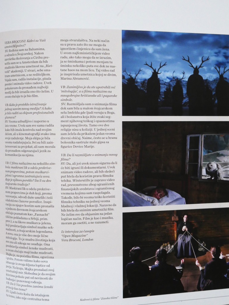 Филмът „Зимна тишина” е експериментална фантастика, с продължителност от 70 мин. Това е първият й дългометражен филм. Заснет е в едно малко селце, където живеят общо 7 души, 2 семейства. Място, където половин година не изгрява слънце. Историята разказва за една вдовица и четирите й пораснали дъщери, който загубват опората в семейството – техния съпруг и баща. Силната им католическа вяра ги обрича на дълъг траур и целомъдрие. Невъзможността да получат любов измъчва младите жени в продължение на години. До появата на мистични мъже, преобразени като елени, което променя всичко. Филм, в който липсват реплики, всичко е на базата на внушения и асоциации. И както самата авторка подчерта преди старта на прожекцията: „Искам да обясня, че това е арт филм и не винаги е нещо, което ще се разбере. Разгледайте го като поема. Насладете се. В процеса на направата на филма разбрах, че колкото по-малко изречения има, толкова по-важни са думите и внушенията”. „Зимна тишина” печели наградата „Златен телец” и е избран за престижния фестивал „Берлинале” /2009/. След прожекцията присъстващите имаха възможност да поговорят с авторката, да зададат своите въпроси, да споделят впечатления. Самата Вайс сподели, че тълкуването за всеки е различно, при срещите и си със различни зрители част от тях са искали дефиниции на различни моменти, а друга част предпочитали да оставят собственото усещане за събитията във филма и мистиката около него.