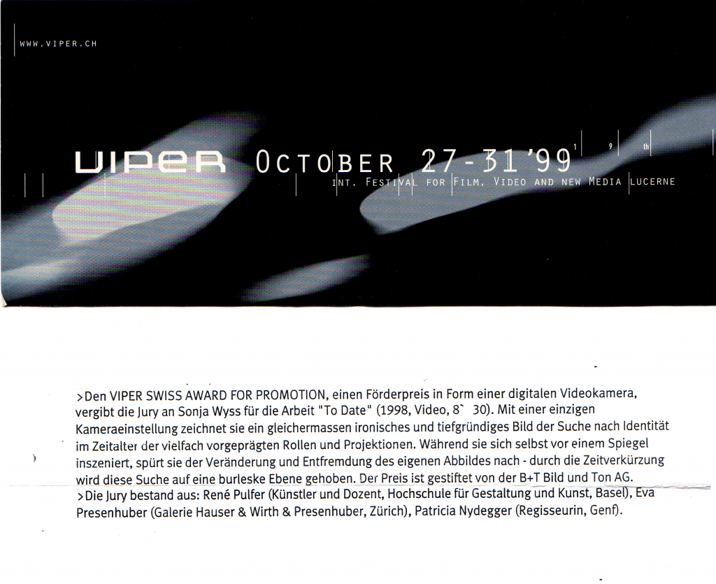 Den VIPER SWISS AWARD FOR PROMOTION, vergibt die Jury an Sonja Wyss für die Arbeit “TO DATE”. Mit einer einzigen Kameraeinstellung zeichnet sie ein gleichermassen ironisches und tiefgründiges Bild der Suche nach Identität im Zeitalter der vielfach vorgeprägten Rollen und Projektionen. Während sie sich selbst vor einem Spiegel inszeniert, spürt sie der Veränderung und Entfremdung des eigenen Abbildes nach – durch die Zeitverkürzung wird diese Suche auf eine burleske Ebene gehoben. Der Preis ist gestiftet von der B+T Bild und Ton AG.