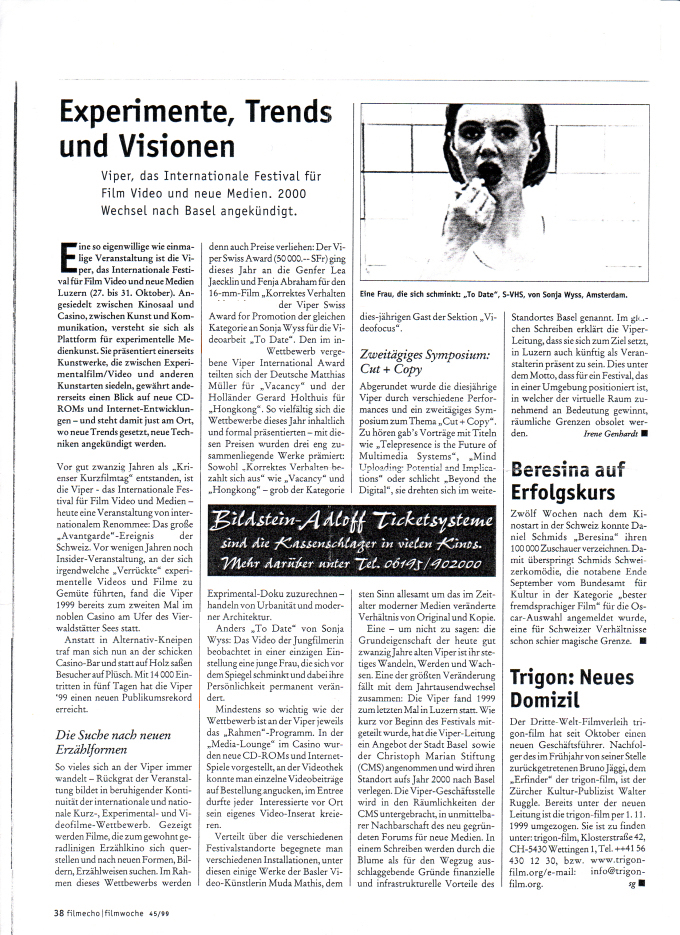 Dazwischen wird Hauptprobe fürs Rendevous gehalten: eine Zigarette angezündet, geflirtet, gelacht, die Augen zum abgebrühten Femme-fatale-Blick verengt oder görenhaft Kaugummi gekaut. Mit wenigen technischen Mitteln wird so ein komplexer Wandlungsprozess dokumentiert, der in seiner grotesken Steigerung das alltägliche Rollenspiel zur amüsanten Tragikomödie ausarten lässt. Sonja Wyss zeichnet bisher für verschiedene Videoinstallationen und experimentelle Videofilme und erhielt für TO DATE den ersten Preis im Schweizer Wettbewerb der Luzerner Viper 1999. (ds)
