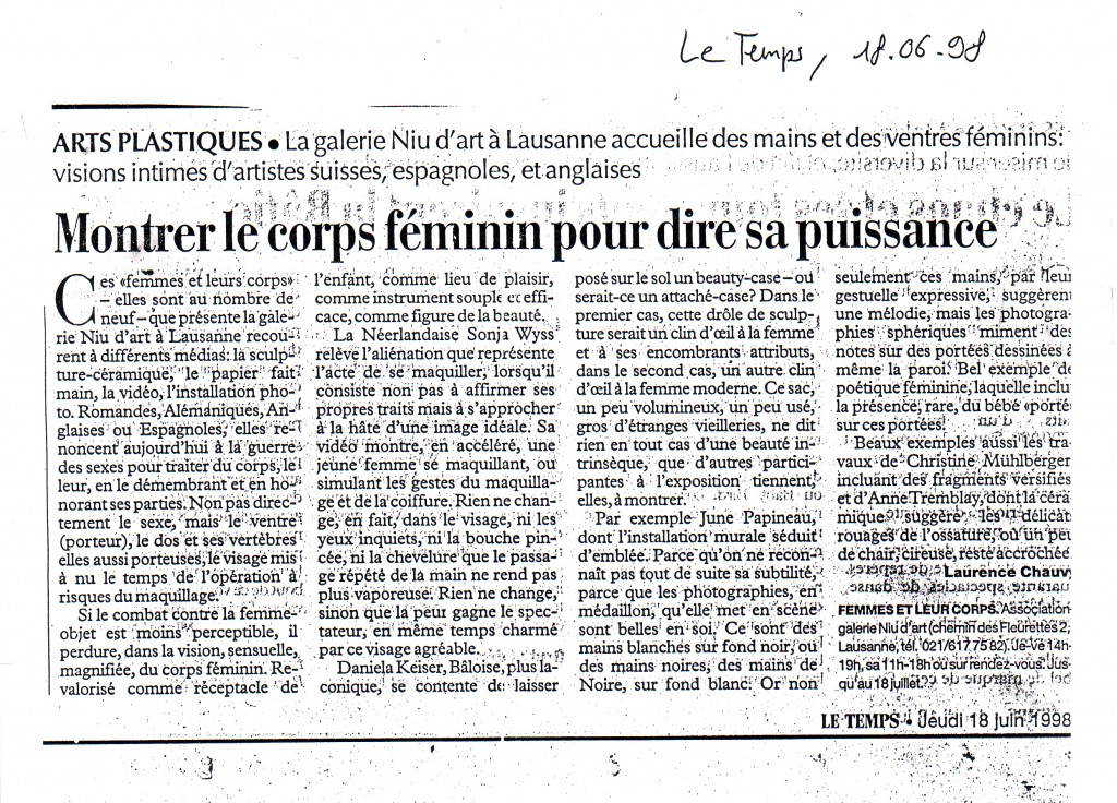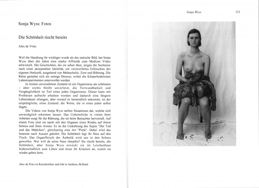 Die Videos von Sonja Wyss stellen Situationen dar, welche sich unverzüglich erkennen lassen. Das Unheimliche in vielen ihrer Arbeiten sorgt für die Rührung die sie bei Betrachter hervorruft. Auf einem Foto sitzt sie nackt mit den Organen eines Rindes auf ihrem Schoss und ihren Armen. Es ist die Umkehrung des Sujets “Der Tod und das Mädchen”, gleichzeitig eine Art “Pietà”. Dabei wird das Innerste nach Aussen gekehrt. Die Schönheit legt ihr Herz auf den Tisch: Das Organfleisch der Ästhetik wird uns in den Schoss geworfen. Wer will da seine Nase rümpfen? Sie riecht bereits, die Schönheit, aber Sonja Wyss erweckt sie im Leichenhaus leidenschaftlich zum Leben und misst ihr Krücken an, womit sie wieder gehen lernt. (Alex de Vries, Kunstkritiker, Arnhem, Holland)