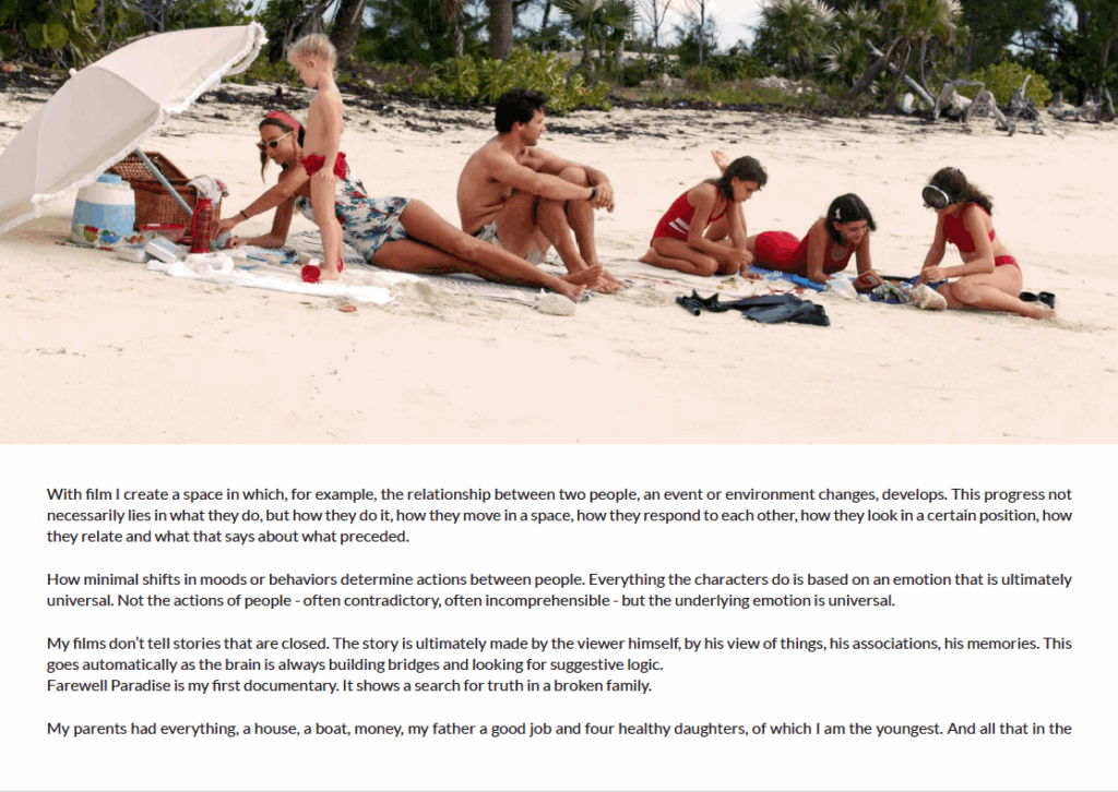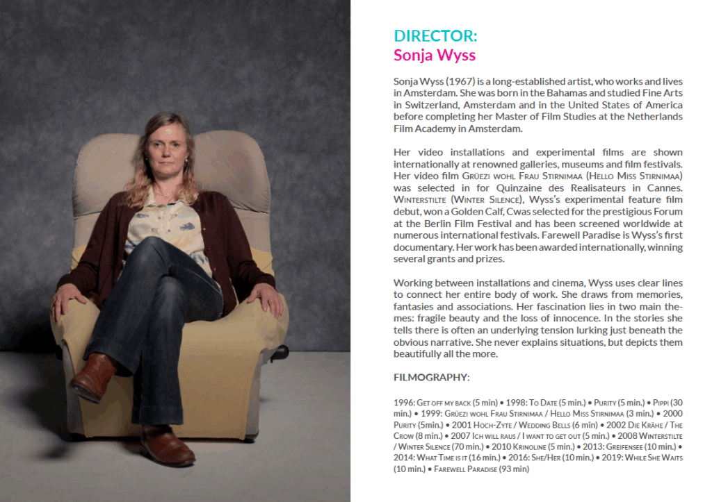 De nieuwe film Farewell Paradise van Sonja Wyss gaat op 25 januari in première op het IFFR (filmfestival Rotterdam). In de film vertelt Wyss het verhaal van haar eigen familie. Na een rustige jeugd op de Bahama’s verhuisden ze in de jaren ’60 halsoverkop naar Zwitserland. Wat is er gebeurd? En hoe ga je daar mee om? De verhalen van haar drie zussen zorgen ervoor dat we langzaam steeds meer over deze familie te weten komen.