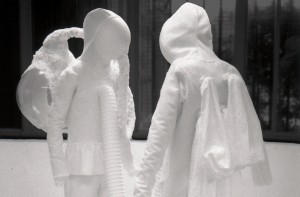 INTIMACY This work shows two human figures wearing fantasy astronaut suits. Like Siamese twins they seem to be connected with ...