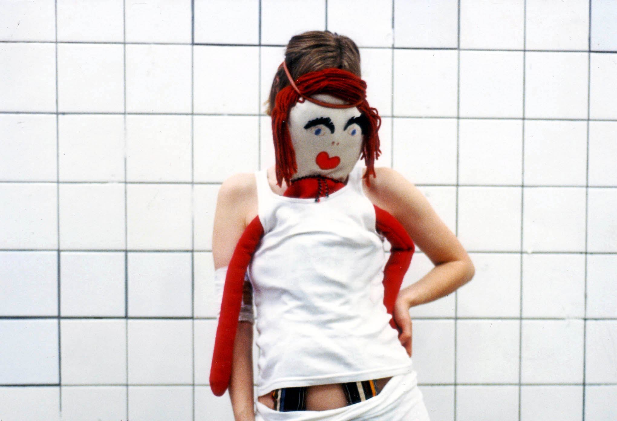 …In her Self-portrait as a “puppet” the artist raises questions regarding an unknown female identity: why is she hiding behind a mask? Do women hide behind a facade of make-up and feminine behavior? Is it a concealedidentity? The artist remains anonymous to the viewers and perhaps to even herself. The childishdoll-like mask, which the artist uses as a shield, contrasts with her maturefemale body. This fusion represents the transition between being a girl to a woman; an awkward stage, where a new sense of identity emerges.