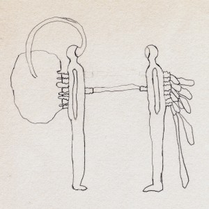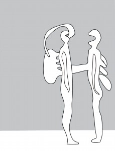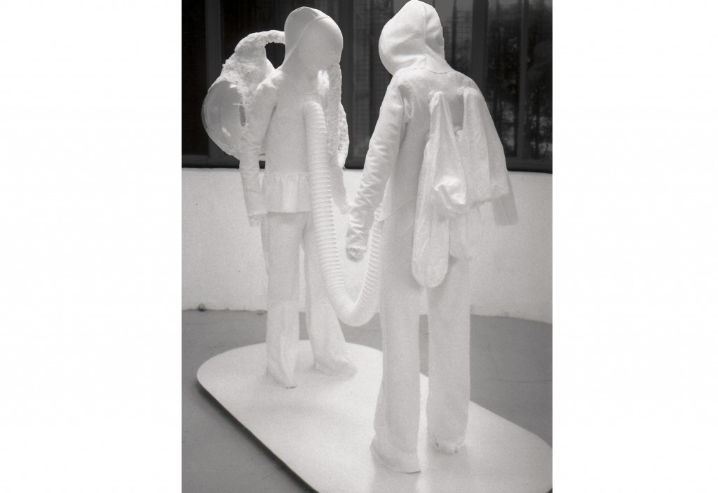 This work shows two human figures wearing fantasy astronaut suits. Like Siamese twins they seem to be connected with each other. They are totally isolated from their surrounding, but at the same time they are infinitely intimate in their correlation.