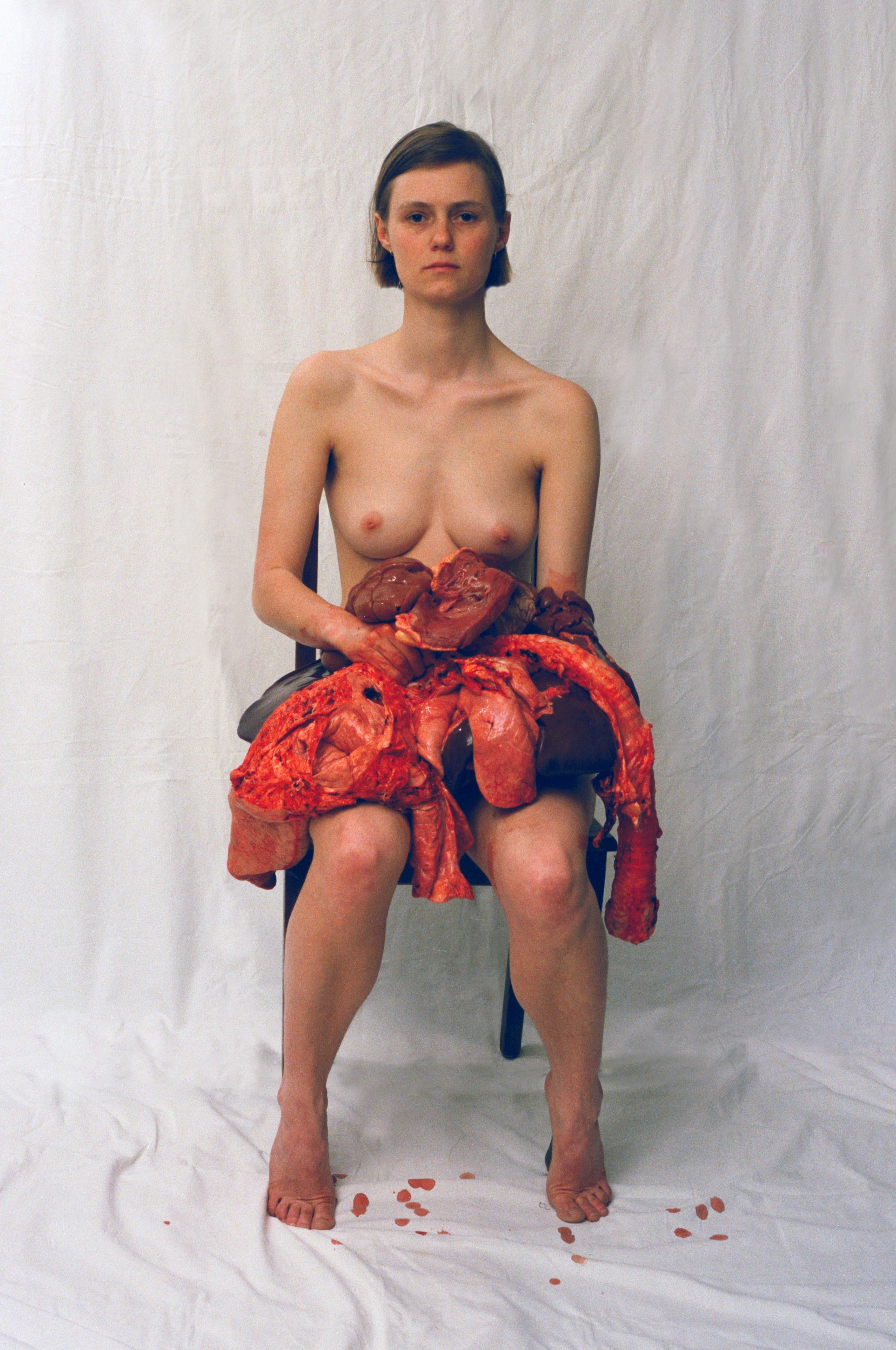 …..On a photograph she sits naked with the organs of a cow on her lap and her arms. It is the reversal of the subject “Der Tod und das Mädchen” “death and the girl” and at the same times a kind of “Pieta”. The internal is turned outward. The beauty puts its heart on the table: the organ meat of the aesthetics is thrown us into our lap. Who wants to turn its nose there? It smells already, the beauty, but Sonja Wyss arouses it from the mortuary passionately to the life and measures her crutches on, with which she learns to walk again.