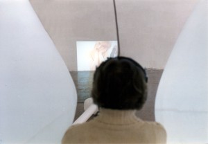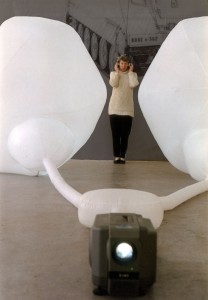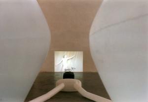 Two huge, more than manhigh white balls made of parachute silk are placed in a bright room. The two balls are connected with tubes of the same material to a ventilator that fills them with air constantly. They are illuminated by white light placed inside the balls. The organic form of the construction reminds on eigther male and female reproductive organs. A smallformat videoprojection on the bottom of one of the surrounding walls shows a halfnaked young danceres. A pair of headphones hanging from the ceiling invites the spectator to take his position between the two balls and listen to a spoken text. With this action he completes the circle of the installation. As soon he’d put the headphones, he would be listening to a fragmentary monologue over unfulfilled wishes and desires.